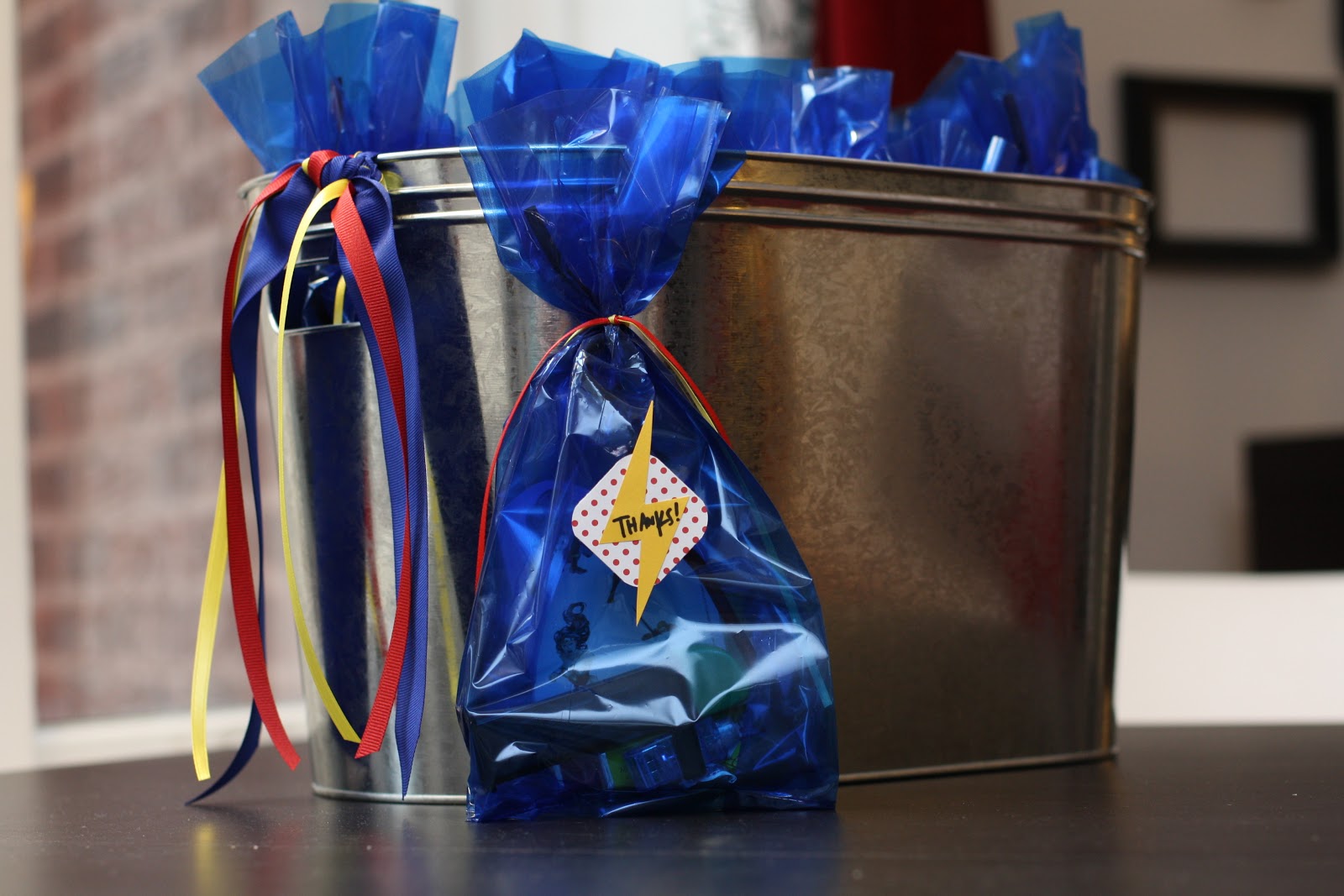 As an additional favor, and in lieu of party hats, I made each guest a super hero inspired mask. I had envisioned the kids all wearing them as they jumped around the bounce house, but it turns out that is a safety hazard. They ended up getting and wearing them while the food was being served. Considering how sweaty they all were by the time we ate, it was probably a good idea anyway.
